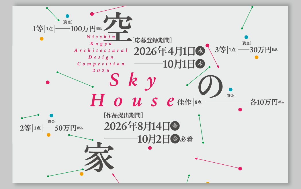 2026/04/01 設計コンペ第53回 日新工業建築設計競技の応募を開始しました今年のテーマは「空の家」です。詳細は、下記専用サイトをご覧ください。応募登録期間:2026年4月1日(水)~10月1日(木)作品提出期間:2026年8月14日(金)~10月2日(金)必着第53回 日新工業建築設計競技設計コンペ専用サイトはこちら